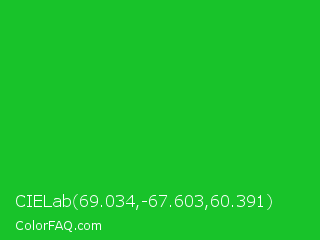 CIELab 69.034,-67.603,60.391 Color is a normal green color and the nearest color is Vivid Malachite #00cc33. Hex code #18c32a and RGB value is rgb(24,195,42). In RGB color space, this color is composed of 9% red, 76% green, 16% blue, In CMYK color space, this color is composed of 88% cyan, 0% magenta, 78% yellow , 24% black , In HSL color space, this color has a hue angle of 126° , 78% saturation and 43% lightness.