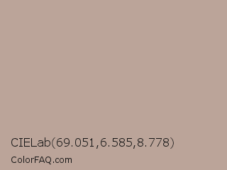 CIELab 69.051,6.585,8.778 Color is a light orange color and the nearest color is Thatch #b69d98. Hex code #bba499 and RGB value is rgb(187,164,153). In RGB color space, this color is composed of 73% red, 64% green, 60% blue, In CMYK color space, this color is composed of 0% cyan, 12% magenta, 18% yellow , 27% black , In HSL color space, this color has a hue angle of 19° , 20% saturation and 67% lightness.