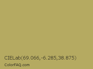 CIELab 69.066,-6.285,38.875 Color is a normal yellow color and the nearest color is Olive Green #b5b35c. Hex code #b5aa61 and RGB value is rgb(181,170,97). In RGB color space, this color is composed of 71% red, 67% green, 38% blue, In CMYK color space, this color is composed of 0% cyan, 6% magenta, 46% yellow , 29% black , In HSL color space, this color has a hue angle of 52° , 36% saturation and 55% lightness.