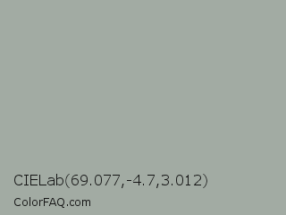 CIELab 69.077,-4.7,3.012 Color is a light green color and the nearest color is Quick Silver #a6a6a6. Hex code #a2aba3 and RGB value is rgb(162,171,163). In RGB color space, this color is composed of 64% red, 67% green, 64% blue, In CMYK color space, this color is composed of 5% cyan, 0% magenta, 5% yellow , 33% black , In HSL color space, this color has a hue angle of 127° , 5% saturation and 65% lightness.