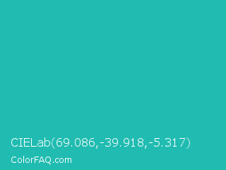 CIELab 69.086,-39.918,-5.317 Color is a normal cyan color and the nearest color is Light Sea Green #20b2aa. Hex code #21bcb1 and RGB value is rgb(33,188,177). In RGB color space, this color is composed of 13% red, 74% green, 69% blue, In CMYK color space, this color is composed of 82% cyan, 0% magenta, 6% yellow , 26% black , In HSL color space, this color has a hue angle of 176° , 70% saturation and 43% lightness.