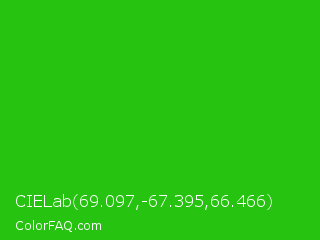 CIELab 69.097,-67.395,66.466 Color is a normal green color and the nearest color is Harlequin Green #46cb18. Hex code #26c310 and RGB value is rgb(38,195,16). In RGB color space, this color is composed of 15% red, 76% green, 6% blue, In CMYK color space, this color is composed of 81% cyan, 0% magenta, 92% yellow , 24% black , In HSL color space, this color has a hue angle of 113° , 85% saturation and 41% lightness.