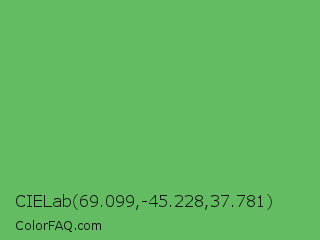 CIELab 69.099,-45.228,37.781 Color is a normal green color and the nearest color is Fern #63b76c. Hex code #63bc61 and RGB value is rgb(99,188,97). In RGB color space, this color is composed of 39% red, 74% green, 38% blue, In CMYK color space, this color is composed of 47% cyan, 0% magenta, 48% yellow , 26% black , In HSL color space, this color has a hue angle of 119° , 40% saturation and 56% lightness.