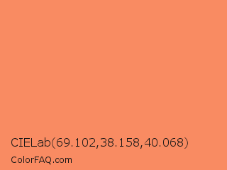 CIELab 69.102,38.158,40.068 Color is a light orange color and the nearest color is Salmon #ff8c69. Hex code #f98b62 and RGB value is rgb(249,139,98). In RGB color space, this color is composed of 98% red, 55% green, 38% blue, In CMYK color space, this color is composed of 0% cyan, 44% magenta, 61% yellow , 2% black , In HSL color space, this color has a hue angle of 16° , 93% saturation and 68% lightness.