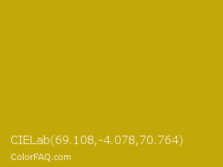 CIELab 69.108,-4.078,70.764 Color is a normal yellow color and the nearest color is Buddha Gold #c1a004. Hex code #c2a809 and RGB value is rgb(194,168,9). In RGB color space, this color is composed of 76% red, 66% green, 4% blue, In CMYK color space, this color is composed of 0% cyan, 13% magenta, 95% yellow , 24% black , In HSL color space, this color has a hue angle of 52° , 91% saturation and 40% lightness.