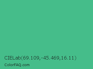 CIELab 69.109,-45.469,16.11 Color is a normal green color and the nearest color is Ocean Green #48bf91. Hex code #45bd8a and RGB value is rgb(69,189,138). In RGB color space, this color is composed of 27% red, 74% green, 54% blue, In CMYK color space, this color is composed of 63% cyan, 0% magenta, 27% yellow , 26% black , In HSL color space, this color has a hue angle of 155° , 48% saturation and 51% lightness.