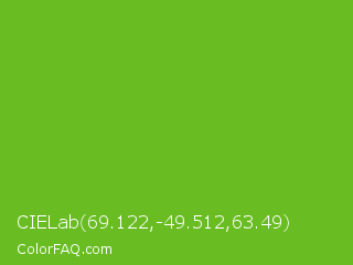 CIELab 69.122,-49.512,63.49 Color is a normal green color and the nearest color is Lima #76bd17. Hex code #69bd22 and RGB value is rgb(105,189,34). In RGB color space, this color is composed of 41% red, 74% green, 13% blue, In CMYK color space, this color is composed of 44% cyan, 0% magenta, 82% yellow , 26% black , In HSL color space, this color has a hue angle of 93° , 70% saturation and 44% lightness.