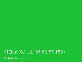 CIELab 69.12,-66.62,57.159 Color is a normal green color and the nearest color is Lime Green #32cd32. Hex code #1bc334 and RGB value is rgb(27,195,52). In RGB color space, this color is composed of 11% red, 76% green, 20% blue, In CMYK color space, this color is composed of 86% cyan, 0% magenta, 73% yellow , 24% black , In HSL color space, this color has a hue angle of 129° , 76% saturation and 44% lightness.