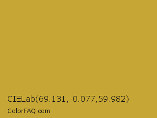 CIELab 69.131,-0.077,59.982 Color is a normal yellow color and the nearest color is Satin Sheen Gold #cba135. Hex code #c6a634 and RGB value is rgb(198,166,52). In RGB color space, this color is composed of 78% red, 65% green, 20% blue, In CMYK color space, this color is composed of 0% cyan, 16% magenta, 74% yellow , 22% black , In HSL color space, this color has a hue angle of 47° , 58% saturation and 49% lightness.