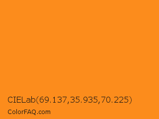 CIELab 69.137,35.935,70.225 Color is a normal orange color and the nearest color is West Side #ff910f. Hex code #fc8c1c and RGB value is rgb(252,140,28). In RGB color space, this color is composed of 99% red, 55% green, 11% blue, In CMYK color space, this color is composed of 0% cyan, 44% magenta, 89% yellow , 1% black , In HSL color space, this color has a hue angle of 30° , 97% saturation and 55% lightness.