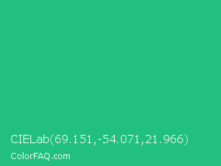 CIELab 69.151,-54.071,21.966 Color is a normal green color and the nearest color is Mountain Meadow Crayola #1ab385. Hex code #21c07f and RGB value is rgb(33,192,127). In RGB color space, this color is composed of 13% red, 75% green, 50% blue, In CMYK color space, this color is composed of 83% cyan, 0% magenta, 34% yellow , 25% black , In HSL color space, this color has a hue angle of 155° , 71% saturation and 44% lightness.