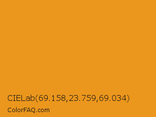 CIELab 69.158,23.759,69.034 Color is a normal orange color and the nearest color is Carrot Orange #ed9121. Hex code #eb961d and RGB value is rgb(235,150,29). In RGB color space, this color is composed of 92% red, 59% green, 11% blue, In CMYK color space, this color is composed of 0% cyan, 36% magenta, 88% yellow , 8% black , In HSL color space, this color has a hue angle of 35° , 84% saturation and 52% lightness.