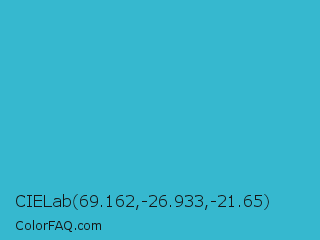 CIELab 69.162,-26.933,-21.65 Color is a normal cyan color and the nearest color is Scooter #2ebfd4. Hex code #36b8cf and RGB value is rgb(54,184,207). In RGB color space, this color is composed of 21% red, 72% green, 81% blue, In CMYK color space, this color is composed of 74% cyan, 11% magenta, 0% yellow , 19% black , In HSL color space, this color has a hue angle of 189° , 61% saturation and 51% lightness.