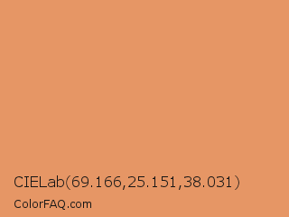 CIELab 69.166,25.151,38.031 Color is a light orange color and the nearest color is Di Serria #db995e. Hex code #e69665 and RGB value is rgb(230,150,101). In RGB color space, this color is composed of 90% red, 59% green, 40% blue, In CMYK color space, this color is composed of 0% cyan, 35% magenta, 56% yellow , 10% black , In HSL color space, this color has a hue angle of 23° , 72% saturation and 65% lightness.