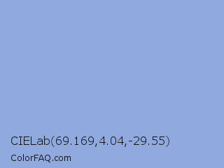 CIELab 69.169,4.04,-29.55 Color is a light blue color and the nearest color is Light Cobalt Blue #88ace0. Hex code #90a9de and RGB value is rgb(144,169,222). In RGB color space, this color is composed of 56% red, 66% green, 87% blue, In CMYK color space, this color is composed of 35% cyan, 24% magenta, 0% yellow , 13% black , In HSL color space, this color has a hue angle of 221° , 54% saturation and 72% lightness.