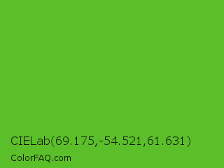 CIELab 69.175,-54.521,61.631 Color is a normal green color and the nearest color is Green RYB #66b032. Hex code #5abf28 and RGB value is rgb(90,191,40). In RGB color space, this color is composed of 35% red, 75% green, 16% blue, In CMYK color space, this color is composed of 53% cyan, 0% magenta, 79% yellow , 25% black , In HSL color space, this color has a hue angle of 100° , 65% saturation and 45% lightness.