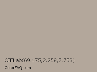 CIELab 69.175,2.258,7.753 Color is a light orange color and the nearest color is Cloudy #aca59f. Hex code #b3a79b and RGB value is rgb(179,167,155). In RGB color space, this color is composed of 70% red, 65% green, 61% blue, In CMYK color space, this color is composed of 0% cyan, 7% magenta, 13% yellow , 30% black , In HSL color space, this color has a hue angle of 30° , 14% saturation and 65% lightness.