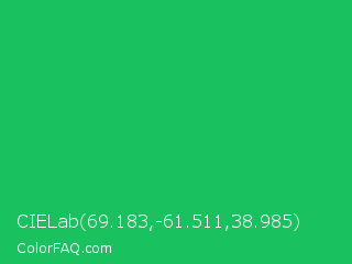 CIELab 69.183,-61.511,38.985 Color is a normal green color and the nearest color is Malachite #0bda51. Hex code #19c25e and RGB value is rgb(25,194,94). In RGB color space, this color is composed of 10% red, 76% green, 37% blue, In CMYK color space, this color is composed of 87% cyan, 0% magenta, 52% yellow , 24% black , In HSL color space, this color has a hue angle of 144° , 77% saturation and 43% lightness.