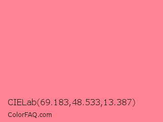 CIELab 69.183,48.533,13.387 Color is a light red color and the nearest color is Tulip #ff878d. Hex code #ff8393 and RGB value is rgb(255,131,147). In RGB color space, this color is composed of 100% red, 51% green, 58% blue, In CMYK color space, this color is composed of 0% cyan, 49% magenta, 42% yellow , 0% black , In HSL color space, this color has a hue angle of 352° , 100% saturation and 76% lightness.