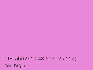 CIELab 69.19,48.603,-25.512 Color is a light magenta color and the nearest color is Pale Magenta #f984e5. Hex code #e987d8 and RGB value is rgb(233,135,216). In RGB color space, this color is composed of 91% red, 53% green, 85% blue, In CMYK color space, this color is composed of 0% cyan, 42% magenta, 7% yellow , 9% black , In HSL color space, this color has a hue angle of 310° , 69% saturation and 72% lightness.