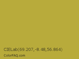 CIELab 69.207,-8.48,56.864 Color is a normal yellow color and the nearest color is Brass #b5a642. Hex code #b8ab3b and RGB value is rgb(184,171,59). In RGB color space, this color is composed of 72% red, 67% green, 23% blue, In CMYK color space, this color is composed of 0% cyan, 7% magenta, 68% yellow , 28% black , In HSL color space, this color has a hue angle of 54° , 51% saturation and 48% lightness.