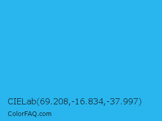 CIELab 69.208,-16.834,-37.997 Color is a normal blue color and the nearest color is Button Blue #24a0ed. Hex code #29b5ed and RGB value is rgb(41,181,237). In RGB color space, this color is composed of 16% red, 71% green, 93% blue, In CMYK color space, this color is composed of 83% cyan, 24% magenta, 0% yellow , 7% black , In HSL color space, this color has a hue angle of 197° , 84% saturation and 55% lightness.