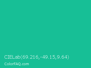CIELab 69.216,-49.15,9.64 Color is a normal cyan color and the nearest color is Mountain Meadow Crayola #1ab385. Hex code #17bf96 and RGB value is rgb(23,191,150). In RGB color space, this color is composed of 9% red, 75% green, 59% blue, In CMYK color space, this color is composed of 88% cyan, 0% magenta, 21% yellow , 25% black , In HSL color space, this color has a hue angle of 165° , 79% saturation and 42% lightness.