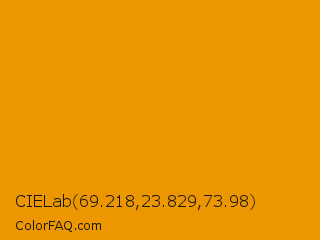 CIELab 69.218,23.829,73.98 Color is a normal orange color and the nearest color is Orange RYB #fb9902. Hex code #ec9601 and RGB value is rgb(236,150,1). In RGB color space, this color is composed of 93% red, 59% green, 0% blue, In CMYK color space, this color is composed of 0% cyan, 36% magenta, 100% yellow , 7% black , In HSL color space, this color has a hue angle of 38° , 99% saturation and 46% lightness.