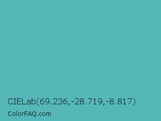 CIELab 69.236,-28.719,-8.817 Color is a normal cyan color and the nearest color is Fountain Blue #56b4be. Hex code #55b8b8 and RGB value is rgb(85,184,184). In RGB color space, this color is composed of 33% red, 72% green, 72% blue, In CMYK color space, this color is composed of 54% cyan, 0% magenta, 0% yellow , 28% black , In HSL color space, this color has a hue angle of 180° , 41% saturation and 53% lightness.