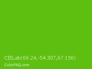 CIELab 69.24,-54.307,67.156 Color is a normal green color and the nearest color is Kelly Green #4cbb17. Hex code #5ebf10 and RGB value is rgb(94,191,16). In RGB color space, this color is composed of 37% red, 75% green, 6% blue, In CMYK color space, this color is composed of 51% cyan, 0% magenta, 92% yellow , 25% black , In HSL color space, this color has a hue angle of 93° , 85% saturation and 41% lightness.