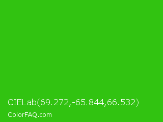 CIELab 69.272,-65.844,66.532 Color is a normal green color and the nearest color is Harlequin Green #46cb18. Hex code #31c311 and RGB value is rgb(49,195,17). In RGB color space, this color is composed of 19% red, 76% green, 7% blue, In CMYK color space, this color is composed of 75% cyan, 0% magenta, 91% yellow , 24% black , In HSL color space, this color has a hue angle of 109° , 84% saturation and 42% lightness.