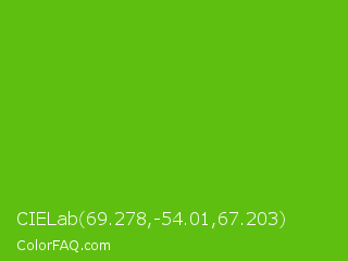 CIELab 69.278,-54.01,67.203 Color is a normal green color and the nearest color is Kelly Green #4cbb17. Hex code #5fbf10 and RGB value is rgb(95,191,16). In RGB color space, this color is composed of 37% red, 75% green, 6% blue, In CMYK color space, this color is composed of 50% cyan, 0% magenta, 92% yellow , 25% black , In HSL color space, this color has a hue angle of 93° , 85% saturation and 41% lightness.