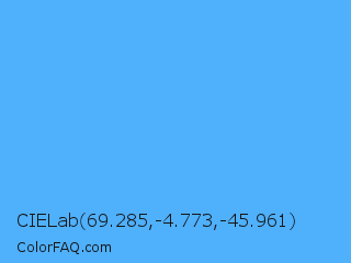 CIELab 69.285,-4.773,-45.961 Color is a light blue color and the nearest color is Blue Jeans #5dadec. Hex code #4fb0fc and RGB value is rgb(79,176,252). In RGB color space, this color is composed of 31% red, 69% green, 99% blue, In CMYK color space, this color is composed of 69% cyan, 30% magenta, 0% yellow , 1% black , In HSL color space, this color has a hue angle of 206° , 97% saturation and 65% lightness.