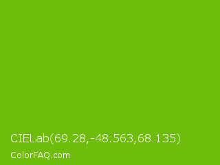 CIELab 69.28,-48.563,68.135 Color is a normal green color and the nearest color is Lima #76bd17. Hex code #6ebd0b and RGB value is rgb(110,189,11). In RGB color space, this color is composed of 43% red, 74% green, 4% blue, In CMYK color space, this color is composed of 42% cyan, 0% magenta, 94% yellow , 26% black , In HSL color space, this color has a hue angle of 87° , 89% saturation and 39% lightness.