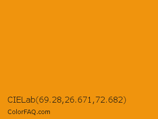 CIELab 69.28,26.671,72.682 Color is a normal orange color and the nearest color is Gamboge #e49b0f. Hex code #f0940d and RGB value is rgb(240,148,13). In RGB color space, this color is composed of 94% red, 58% green, 5% blue, In CMYK color space, this color is composed of 0% cyan, 38% magenta, 95% yellow , 6% black , In HSL color space, this color has a hue angle of 36° , 90% saturation and 50% lightness.