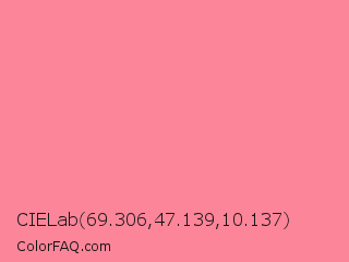 CIELab 69.306,47.139,10.137 Color is a light red color and the nearest color is Tulip #ff878d. Hex code #fc8599 and RGB value is rgb(252,133,153). In RGB color space, this color is composed of 99% red, 52% green, 60% blue, In CMYK color space, this color is composed of 0% cyan, 47% magenta, 39% yellow , 1% black , In HSL color space, this color has a hue angle of 350° , 95% saturation and 75% lightness.