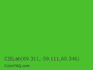 CIELab 69.311,-59.111,60.346 Color is a normal green color and the nearest color is Kelly Green #4cbb17. Hex code #4ac12c and RGB value is rgb(74,193,44). In RGB color space, this color is composed of 29% red, 76% green, 17% blue, In CMYK color space, this color is composed of 62% cyan, 0% magenta, 77% yellow , 24% black , In HSL color space, this color has a hue angle of 108° , 63% saturation and 46% lightness.