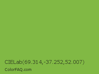 CIELab 69.314,-37.252,52.007 Color is a normal green color and the nearest color is Sushi #87ab39. Hex code #81b944 and RGB value is rgb(129,185,68). In RGB color space, this color is composed of 51% red, 73% green, 27% blue, In CMYK color space, this color is composed of 30% cyan, 0% magenta, 63% yellow , 27% black , In HSL color space, this color has a hue angle of 89° , 46% saturation and 50% lightness.