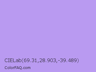 CIELab 69.31,28.903,-39.489 Color is a light violet color and the nearest color is Biloba Flower #b2a1ea. Hex code #b99af1 and RGB value is rgb(185,154,241). In RGB color space, this color is composed of 73% red, 60% green, 95% blue, In CMYK color space, this color is composed of 23% cyan, 36% magenta, 0% yellow , 5% black , In HSL color space, this color has a hue angle of 261° , 76% saturation and 77% lightness.