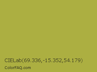 CIELab 69.336,-15.352,54.179 Color is a normal yellow color and the nearest color is Brass #b5a642. Hex code #acaf41 and RGB value is rgb(172,175,65). In RGB color space, this color is composed of 67% red, 69% green, 25% blue, In CMYK color space, this color is composed of 2% cyan, 0% magenta, 63% yellow , 31% black , In HSL color space, this color has a hue angle of 62° , 46% saturation and 47% lightness.