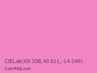 CIELab 69.338,49.611,-14.049 Color is a light magenta color and the nearest color is Persian Pink #f77fbe. Hex code #f385c4 and RGB value is rgb(243,133,196). In RGB color space, this color is composed of 95% red, 52% green, 77% blue, In CMYK color space, this color is composed of 0% cyan, 45% magenta, 19% yellow , 5% black , In HSL color space, this color has a hue angle of 326° , 82% saturation and 74% lightness.