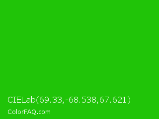 CIELab 69.33,-68.538,67.621 Color is a normal green color and the nearest color is Harlequin Green #46cb18. Hex code #20c408 and RGB value is rgb(32,196,8). In RGB color space, this color is composed of 13% red, 77% green, 3% blue, In CMYK color space, this color is composed of 84% cyan, 0% magenta, 96% yellow , 23% black , In HSL color space, this color has a hue angle of 112° , 92% saturation and 40% lightness.