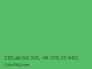 CIELab 69.345,-48.359,33.943 Color is a normal green color and the nearest color is Fern #63b76c. Hex code #56be69 and RGB value is rgb(86,190,105). In RGB color space, this color is composed of 34% red, 75% green, 41% blue, In CMYK color space, this color is composed of 55% cyan, 0% magenta, 45% yellow , 25% black , In HSL color space, this color has a hue angle of 131° , 44% saturation and 54% lightness.