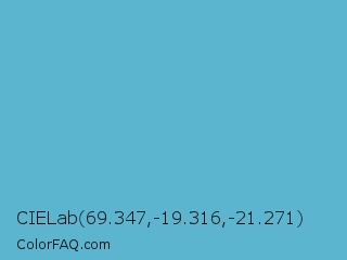 CIELab 69.347,-19.316,-21.271 Color is a normal blue color and the nearest color is Shakespeare #4eabd1. Hex code #5cb5cf and RGB value is rgb(92,181,207). In RGB color space, this color is composed of 36% red, 71% green, 81% blue, In CMYK color space, this color is composed of 56% cyan, 13% magenta, 0% yellow , 19% black , In HSL color space, this color has a hue angle of 194° , 55% saturation and 59% lightness.