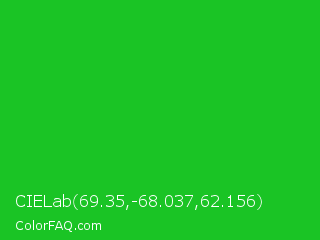 CIELab 69.35,-68.037,62.156 Color is a normal green color and the nearest color is Lime Green #32cd32. Hex code #1ac425 and RGB value is rgb(26,196,37). In RGB color space, this color is composed of 10% red, 77% green, 15% blue, In CMYK color space, this color is composed of 87% cyan, 0% magenta, 81% yellow , 23% black , In HSL color space, this color has a hue angle of 124° , 77% saturation and 44% lightness.