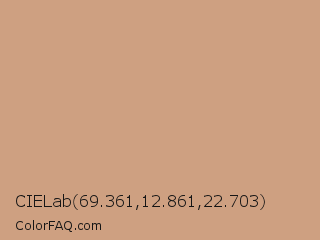 CIELab 69.361,12.861,22.703 Color is a light orange color and the nearest color is Light French Beige #c8ad7f. Hex code #cea081 and RGB value is rgb(206,160,129). In RGB color space, this color is composed of 81% red, 63% green, 51% blue, In CMYK color space, this color is composed of 0% cyan, 22% magenta, 37% yellow , 19% black , In HSL color space, this color has a hue angle of 24° , 44% saturation and 66% lightness.