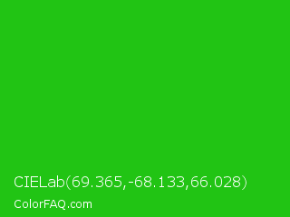 CIELab 69.365,-68.133,66.028 Color is a normal green color and the nearest color is Lime Green #32cd32. Hex code #21c414 and RGB value is rgb(33,196,20). In RGB color space, this color is composed of 13% red, 77% green, 8% blue, In CMYK color space, this color is composed of 83% cyan, 0% magenta, 90% yellow , 23% black , In HSL color space, this color has a hue angle of 116° , 81% saturation and 42% lightness.