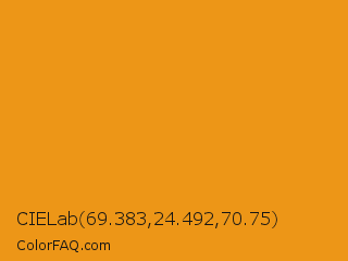 CIELab 69.383,24.492,70.75 Color is a normal orange color and the nearest color is Carrot Orange #ed9121. Hex code #ed9617 and RGB value is rgb(237,150,23). In RGB color space, this color is composed of 93% red, 59% green, 9% blue, In CMYK color space, this color is composed of 0% cyan, 37% magenta, 90% yellow , 7% black , In HSL color space, this color has a hue angle of 36° , 86% saturation and 51% lightness.