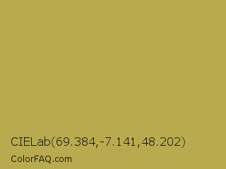 CIELab 69.384,-7.141,48.202 Color is a normal yellow color and the nearest color is Husk #b7a458. Hex code #b8ab4f and RGB value is rgb(184,171,79). In RGB color space, this color is composed of 72% red, 67% green, 31% blue, In CMYK color space, this color is composed of 0% cyan, 7% magenta, 57% yellow , 28% black , In HSL color space, this color has a hue angle of 53° , 43% saturation and 52% lightness.