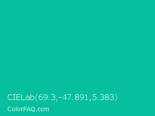 CIELab 69.3,-47.891,5.383 Color is a normal cyan color and the nearest color is Caribbean Green #00cc99. Hex code #05bf9e and RGB value is rgb(5,191,158). In RGB color space, this color is composed of 2% red, 75% green, 62% blue, In CMYK color space, this color is composed of 97% cyan, 0% magenta, 17% yellow , 25% black , In HSL color space, this color has a hue angle of 169° , 95% saturation and 38% lightness.